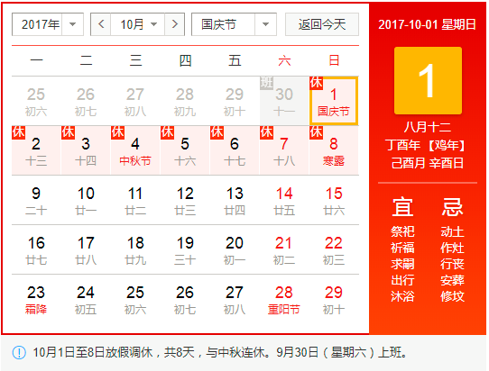 放假時間:10月1日至10月8日,共8天,10月9日(星期一)開始正常上班。請大家提前做好放假前后的準(zhǔn)備,請知曉!