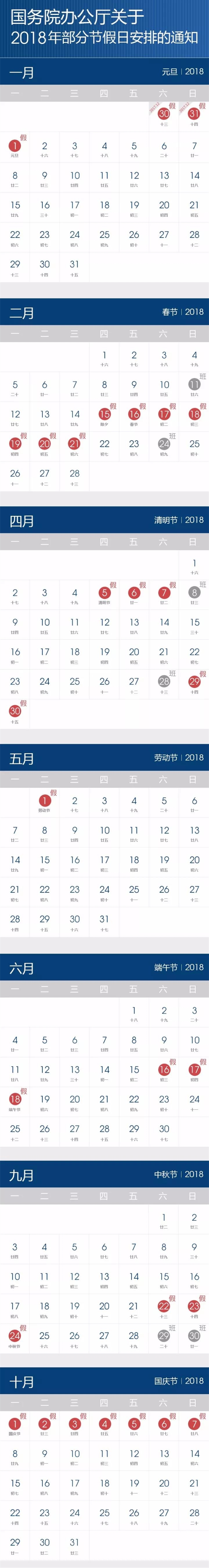 根據(jù)國家規(guī)定,現(xiàn)將2018年元旦、春節(jié)、清明節(jié)、勞動節(jié)、端午節(jié)、中秋節(jié)和國慶節(jié)放假調(diào)休日期的具體安排通知如下。
