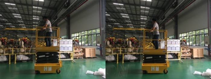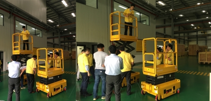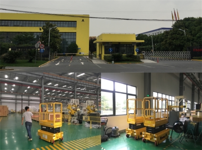 兩臺Veedon品牌升降作業(yè)平臺在發(fā)那科機(jī)器人工廠流水線投入使用,交接及培訓(xùn)現(xiàn)場,訂制FANUC 黃色