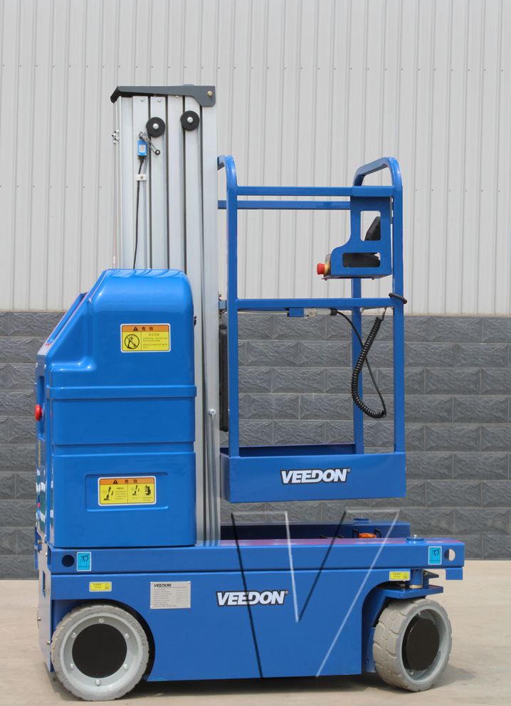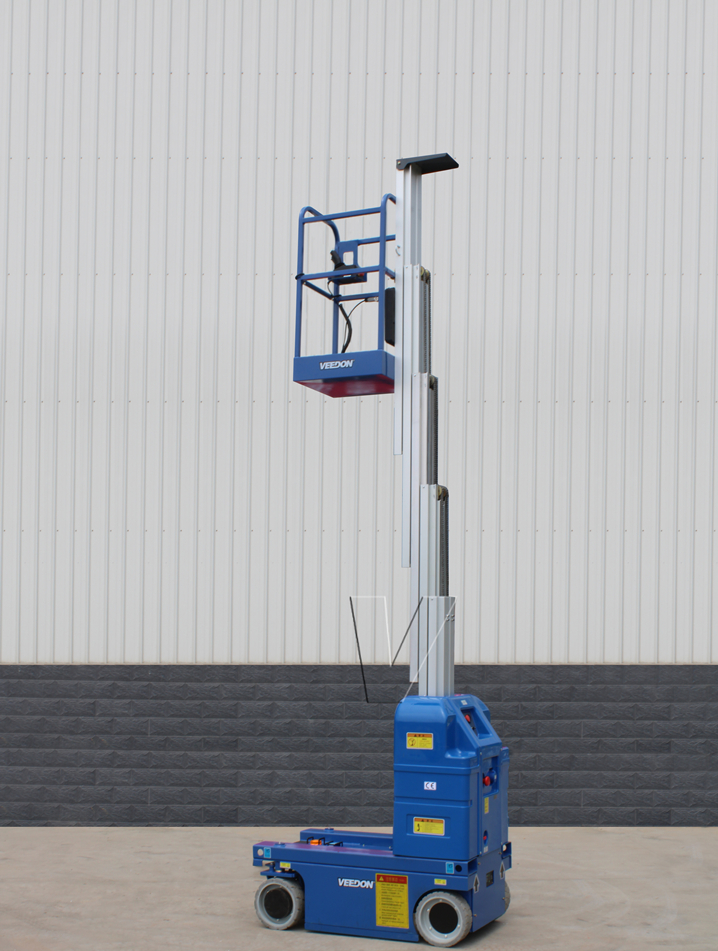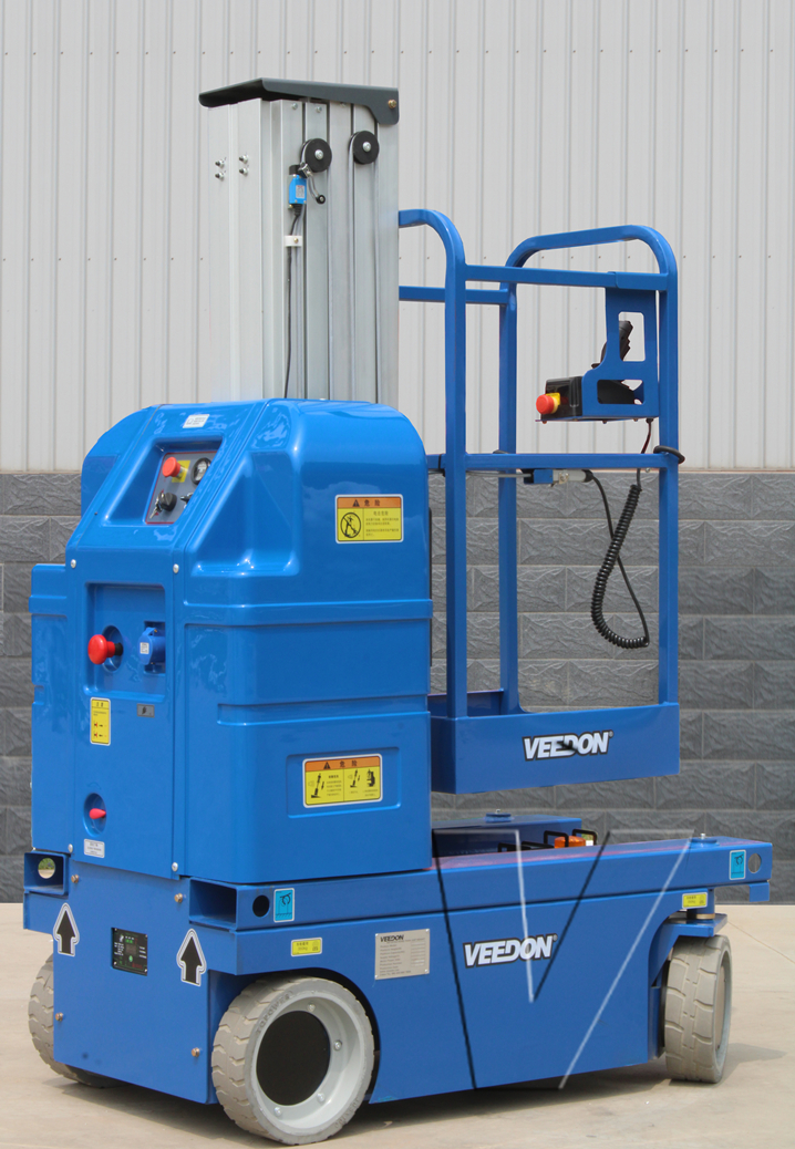 該產(chǎn)品全自動(dòng)單桅桿高空作業(yè)平臺(tái),型號(hào):VAWP0216,整車尺寸,平臺(tái)尺寸非標(biāo)訂做,更適用于工作現(xiàn)場(chǎng)的需求,顏色定制艾默生藍(lán)色